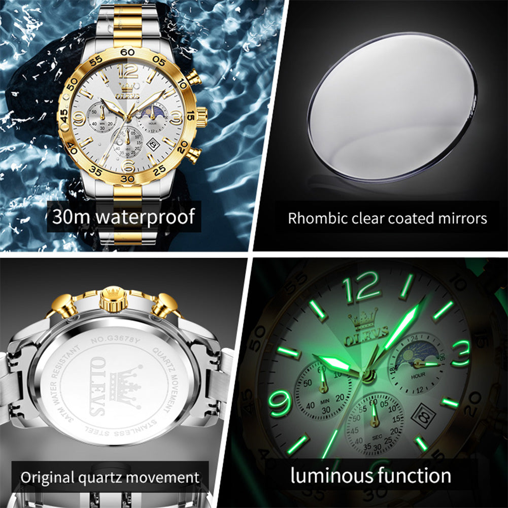OLEVS 3678 Relojes para Hombre de Lujo Vestido Cronógrafo Analógico Cuarzo Chapado en Oro Acero Inoxidable Fase Lunar Impermeable Luminoso Fecha Relojes de Pulsera de Moda para Hombre Reloj Para Hombre