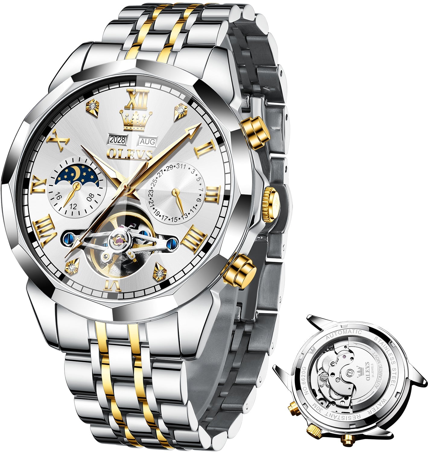 OLEVS 6620 Automatic Watches for Men Self Winding Mechanical Skeleton Luxury Dress Chronograph Gold Plated Stainless Steel Calendar Moon Phase Waterproof Luminous Mens Wrist Watches Reloj Para Hombre