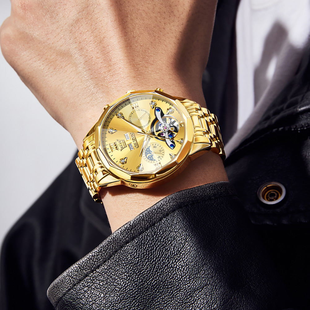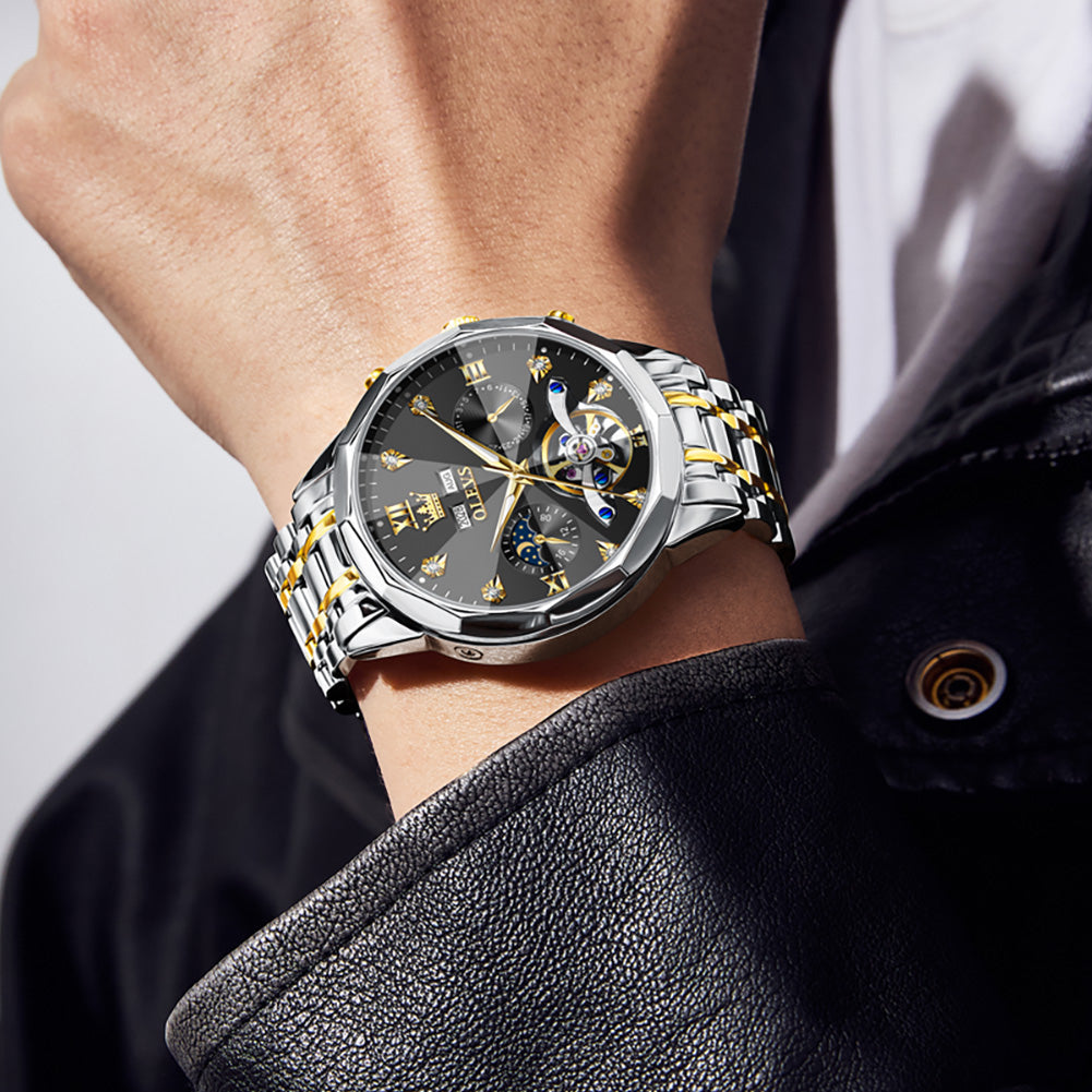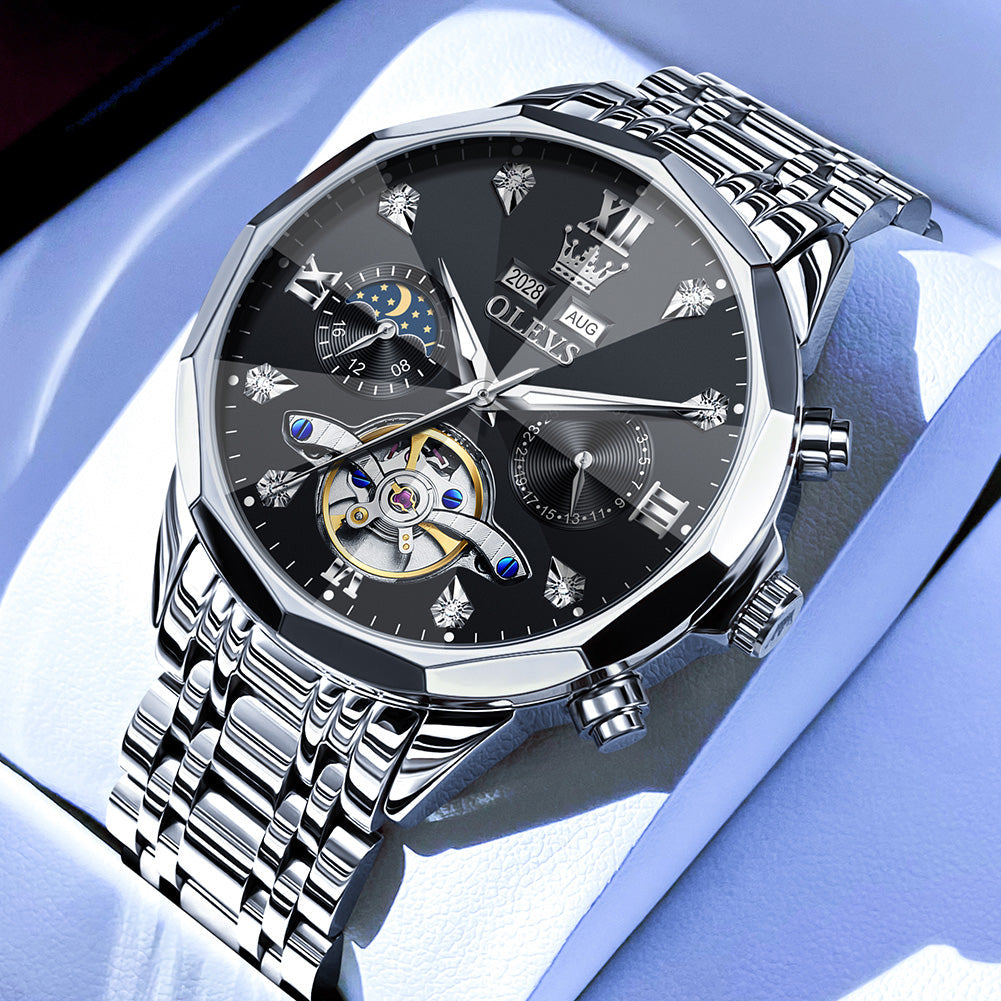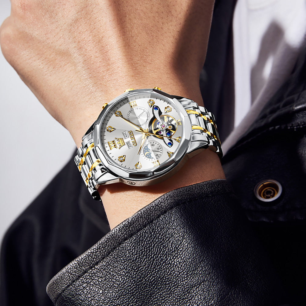 OLEVS 6621Automatic Watches for Men Luxury Dress Waterproof Self Winding Mechanical Moon Phase Chronograph Stainless Steel Luminous Diamond Date Skeleton Tourbillon Wristwatch for Men Reloj Para Hombre