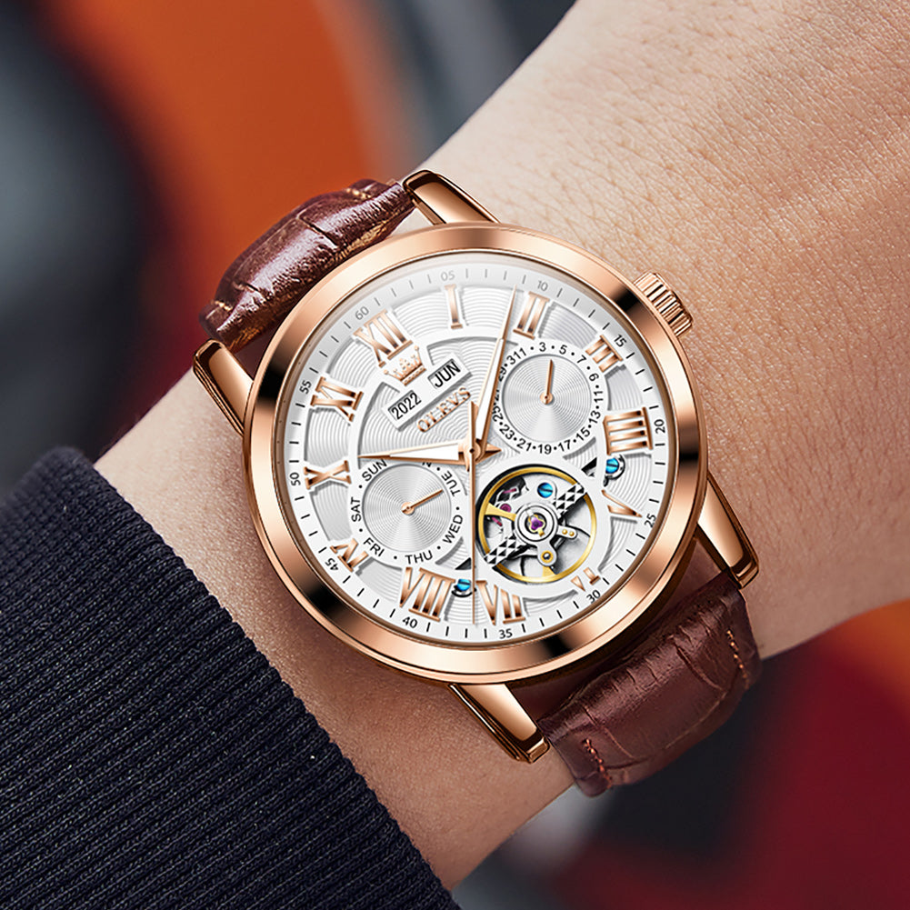 OLEVS 6668 Automatic Watches for Men Self Winding Mechanical Skeleton Flywheel Multifunction Luxury Dress Roma Rumerals Calendar Waterproof Luminous Mens Wrist Watches Reloj Para Hombre Brown Black Leather Strap
