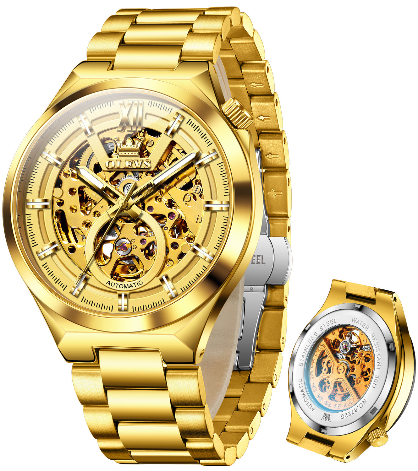 OLEVS 6722 Skeleton Watches for Men Luxury Dress Automatic Self Winding Mechanical Gold Plated Stainless Steel Waterproof Luminous Business Men Wrist Watch Reloj Para Hombre