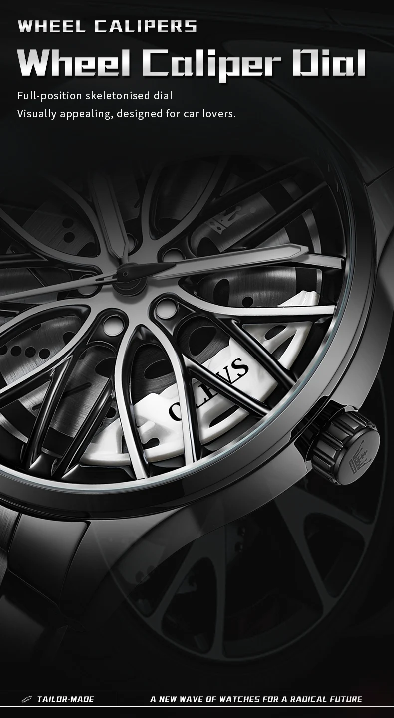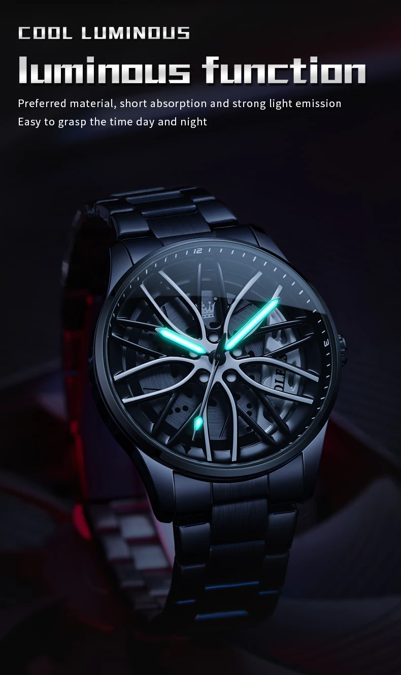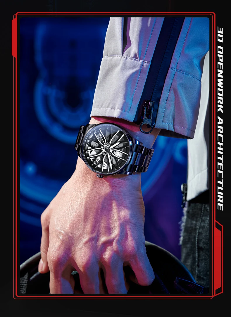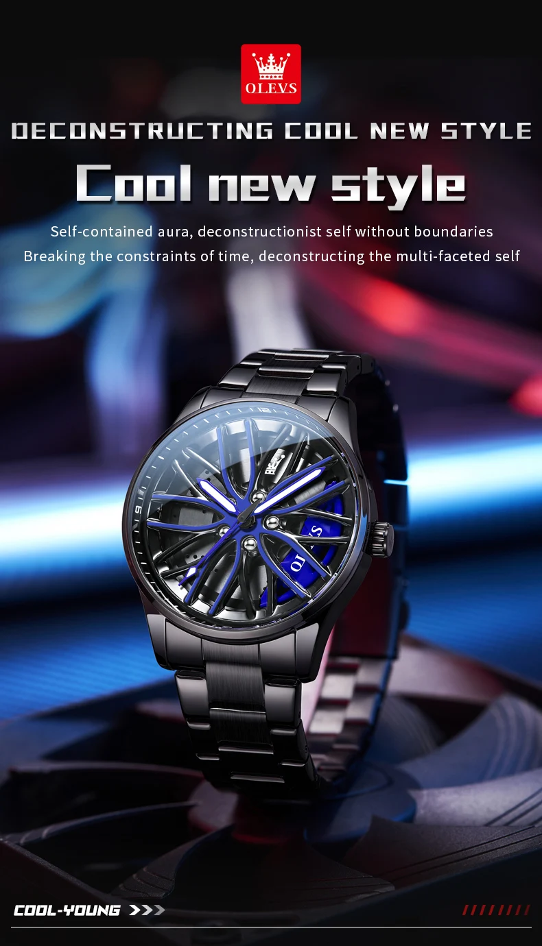OLEVS 9937 Men's Watch Rotary Dial Skeleton Waterproof Luminous Hollow Wheel Hub Fashion Sports Stainless Steel Quartz Watch