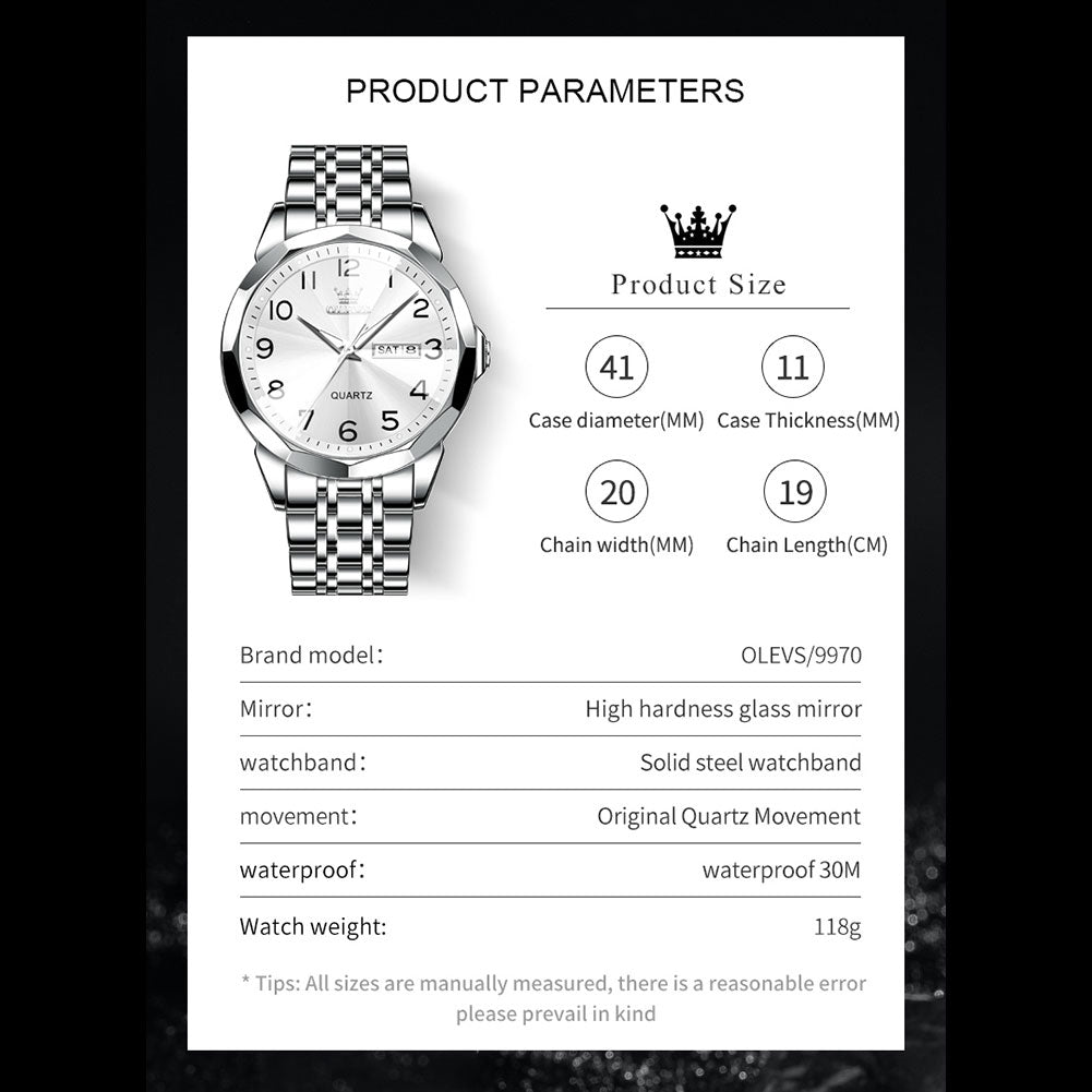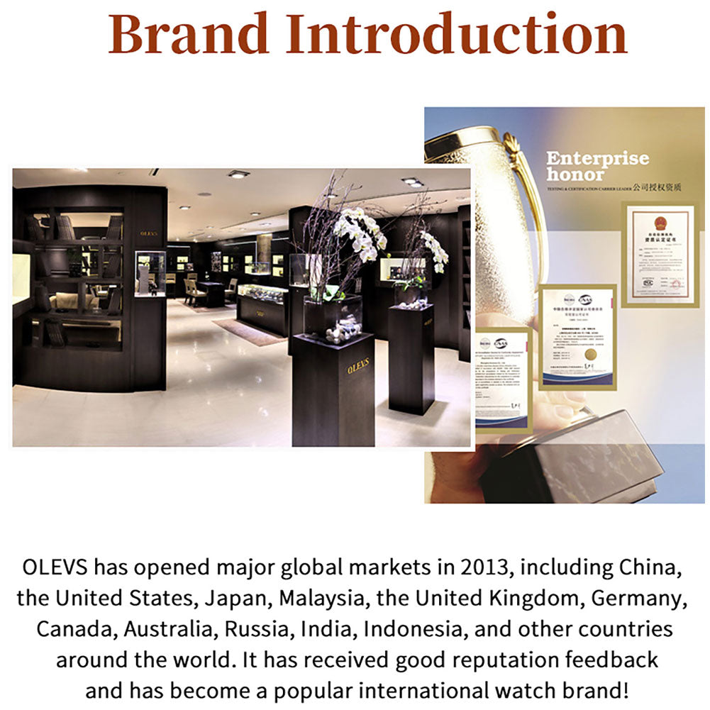 - OLEVS watch model: 9970; Mirror: High hardness watch; Movement: Imported quartz movement and battery.